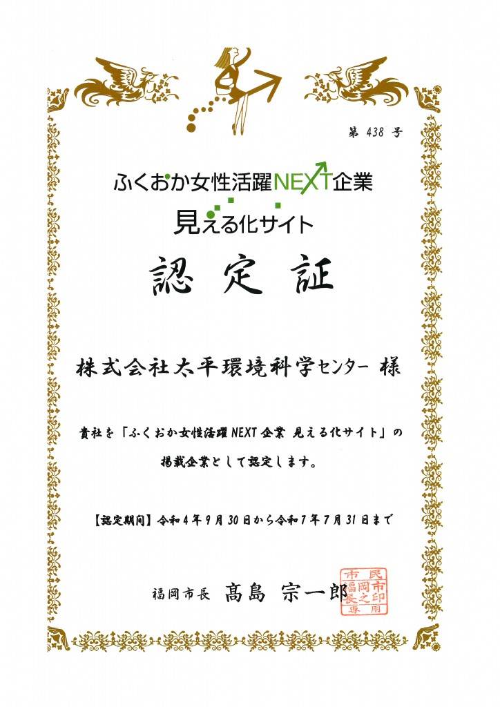 福岡市より「ふくおか女性活躍NEXT企業 見える化サイト」の掲載企業として認定を受けました。